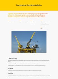 Thunder Cranes was founded in 1995 to service the growing need for offshore rental cranes and expert lifting solutions in the offshore oilfields of Asia. Building on a strong commitment to safety, efficiency, and customer satisfaction, Thunder Cranes has earned a global reputation as a trusted partner in the oil and gas industry.